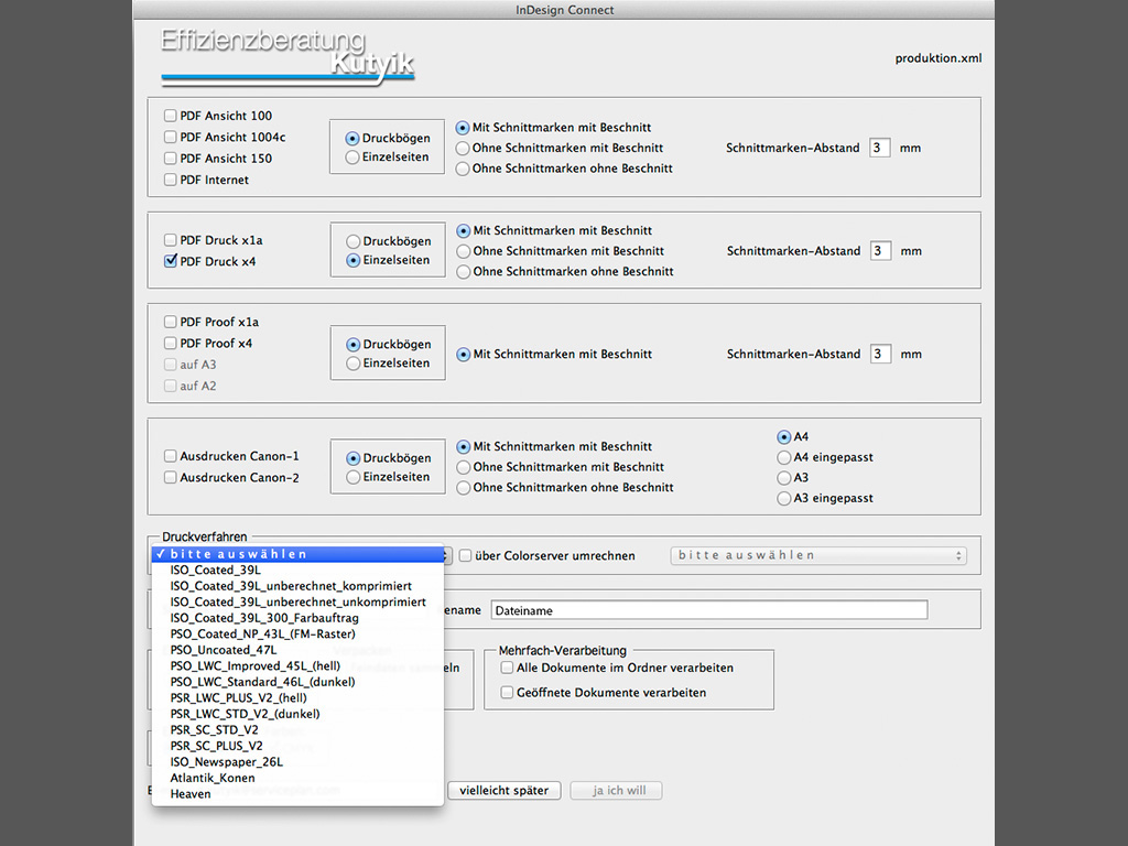 Mit isobella-media reduzieren Sie die Wartezeiten zur Erstellung von PDFs deutlich und vereinfachen die Auswahl des gewünschten PDFs selbsterklärend. Hier greifen gleich mehrere Optimierungen ineinander. Um ein PDF zu erstellen, wählen Sie mit gewohntem Druckbefehl, welche Art von PDF Sie wünschen (Mehrfachauswahl möglich). Im Hintergrund wird das PDF auf Hochleistungsservern mit den dafür hinterlegten Einstellungen geschrieben und gleich wieder in den richtigen Jobordner abgelegt. Alles vollautomatisch. Der User kann in der Zwischenzeit weiterarbeiten. Ein weiterer Vorteil ist die Produktionssicherheit. Egal, wer auf welchem Rechner ein PDF erstellt: Das Ergebnis ist immer exakt identisch.