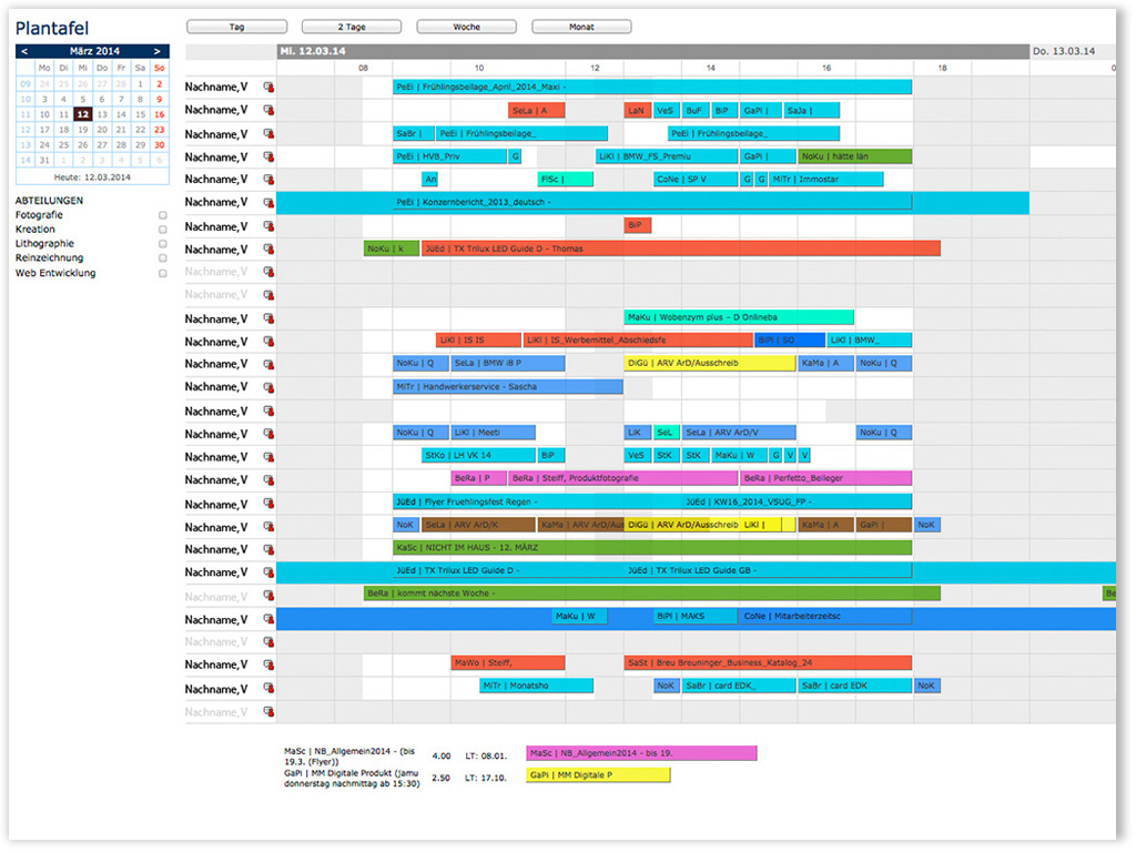 Wie können Sie die Auslastung des Personals optimal überwachen und steuern? Durch eine eigenentwickelte Software lässt sich die maximale Auslastung der Personalressourcen planen und steuern. Die Darstellung aller Mitarbeiter und deren Zeiten sind im internen Auftragsmanagementsystem mit Urlaubsplanung, Krankheitsmeldung, Feiertagen etc. direkt verknüpft. In der Übersicht ist nicht anwesendes Personal ausgegraut. Zur besseren Darstellung lassen sich auch einzelne Abteilungen gruppieren.